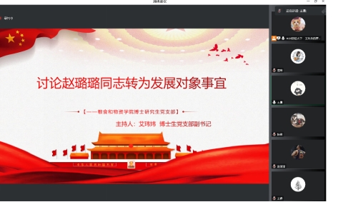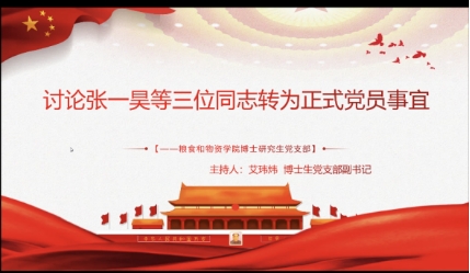 2022年12月9日,按照疫情防控相关要求,博士生党支部以线上形式召开支部大会,讨论关于张一昊等三位同志转正、赵璐璐同志转为发展对象以及学生支委换届事宜。本次会议副书记艾玮炜同志主持