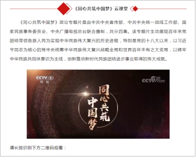 学院充分发掘专业宣教资源,选取由中共中央宣传部、中共中央统一战线工作部、国家民族事务委员会、中央广播电视总台联合摄制的政论专题片《同心共筑中国梦》,发布给学院师生观看。该专题片生动展现百年来党团结带领各族人民为实现中华民族伟大复兴的历史进程,特别是党的十八大以来,以习近平同志为核心的党中央统筹中华民族伟大复兴战略全局和世界百年未有之大变局,以铸牢中华民族共同体意识为主线,创新推动新时代民族团结进步事业取得的伟大成就,在师生中引起较大反响。
