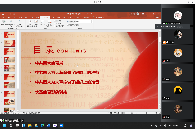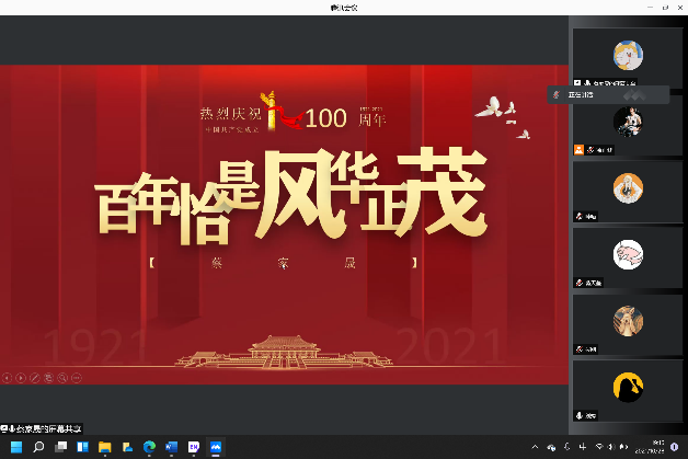 2021年10月28日晚,yl23411永利集团官网研究生党支部于线上开展了主题为“中共四大与大革命的高潮”与“百年恰是风华正茂”的党史学习教育。活动由硕士研究生党支部书记刘婷同志主持,2019级硕士研究生党员翁天玺同志和蔡家晟同志带领支部成员学习。