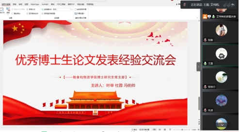 在党的二十大胜利召开之际,为更加紧密地团结在以习近平同志为核心的党中央周围,全面贯彻习近平新时代中国特色社会主义思想,深刻领悟“两个确立”的决定性意义,增强“四个意识”、坚定“四个自信”、做到“两个维护”,踔厉奋发、勇毅前行,博士生党支部于10月25日围绕“理论学习+科学研究”,开展学习领悟党的二十大精神暨粮食安全主题学术论文撰写发表经验交流会。活动由博士生支部书记王晨老师主持,全体博士研究生参加学习交流。