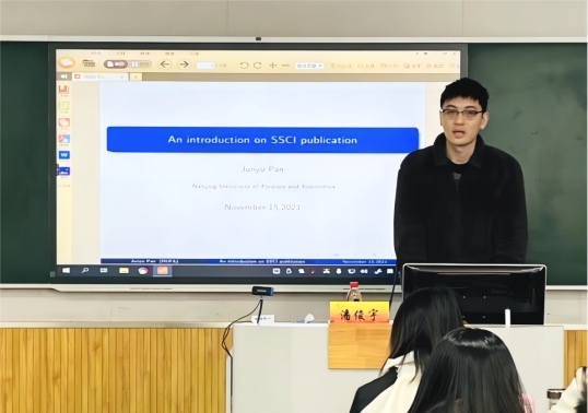 2023年11月15日,我院博士生党支部在仙林校区教A111教室举行主题党日活动,邀请2021级在读博士研究生潘俊宇同志开展了以“英文论文投稿期刊选择与写作经验”为主题的朋辈沙龙,活动由我院博士生党支部书记王晨老师主持。经济学院、工商管理学院、艺术设计学院以及我院广大硕博士研究生参加了此次活动。