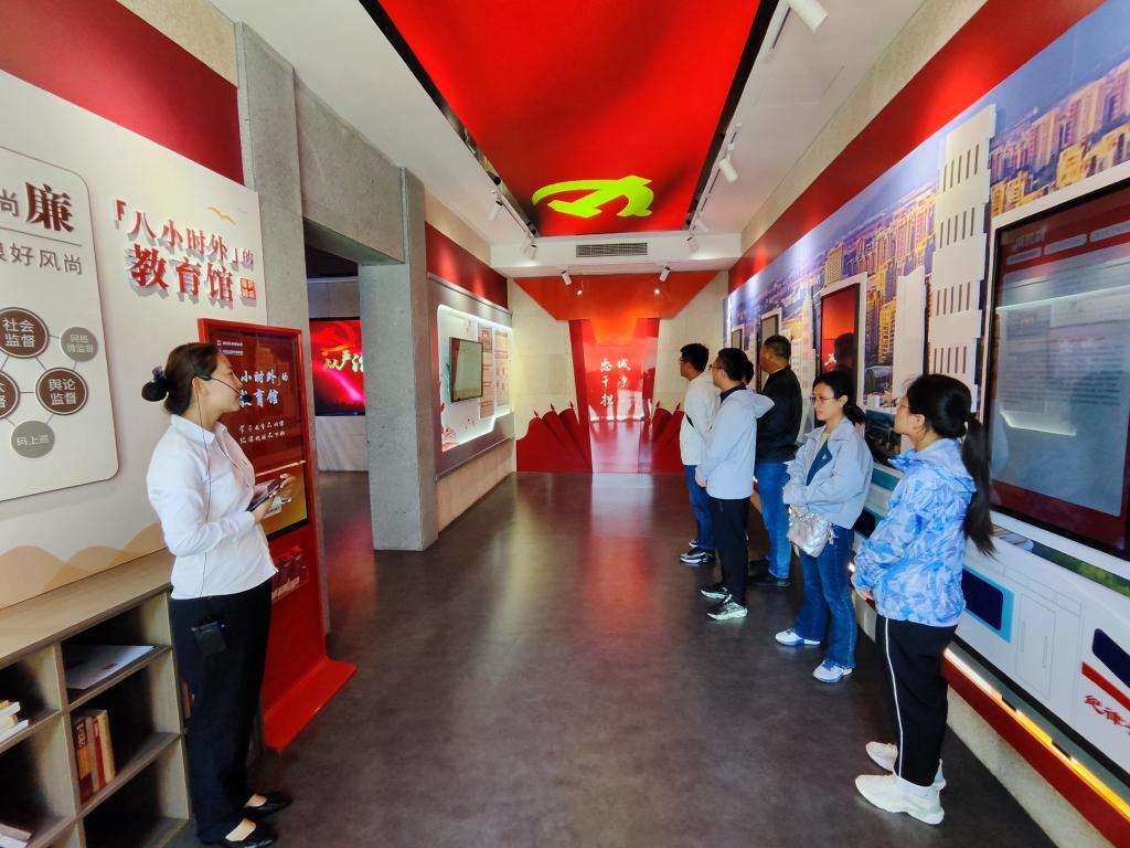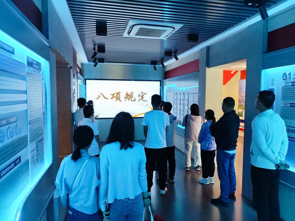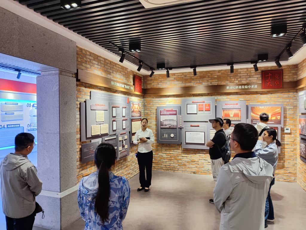 在讲解员的引导下,大家步入展厅。醒目突出的“纪律”二字映入眼帘,大家仔细认真浏览《中国共产党的第一个纲领》全文,深刻领悟纪律建设提出的历史背景和深层次含义。 “忠实、考察、监督、保守秘密”几个大字展示了中国共产党最早的严格纪律要求,钢铁材质的版面则寓意着党的纪律坚硬有力,让大家更直观感受纪律约束的严肃性。随后,大家沿着历次党代会的历史脉络,系统参观了“奠基淬炼”“曲折发展”“迈向成熟”“伟大创举”四个主题,从党的纪律的起源、内涵、机构、处分、依据、典型案例等多方面,重温中国共产党的纪律建设之路,聆听历史回声,感受纪律力量。透过时空转换和历史跨越,展馆内形象生动的电影短片、一个个真实鲜活的案例、一组组图文并茂的诠释,给大家带来深刻震撼。大家集中精神、认真观看、用心聆听,通过回顾党的纪律建设历程,深入了解了党的纪律建设在不同历史阶段的探索与实践;深刻理解了纪律是党的生命线,要时刻谨守,树牢底线、红线意识。