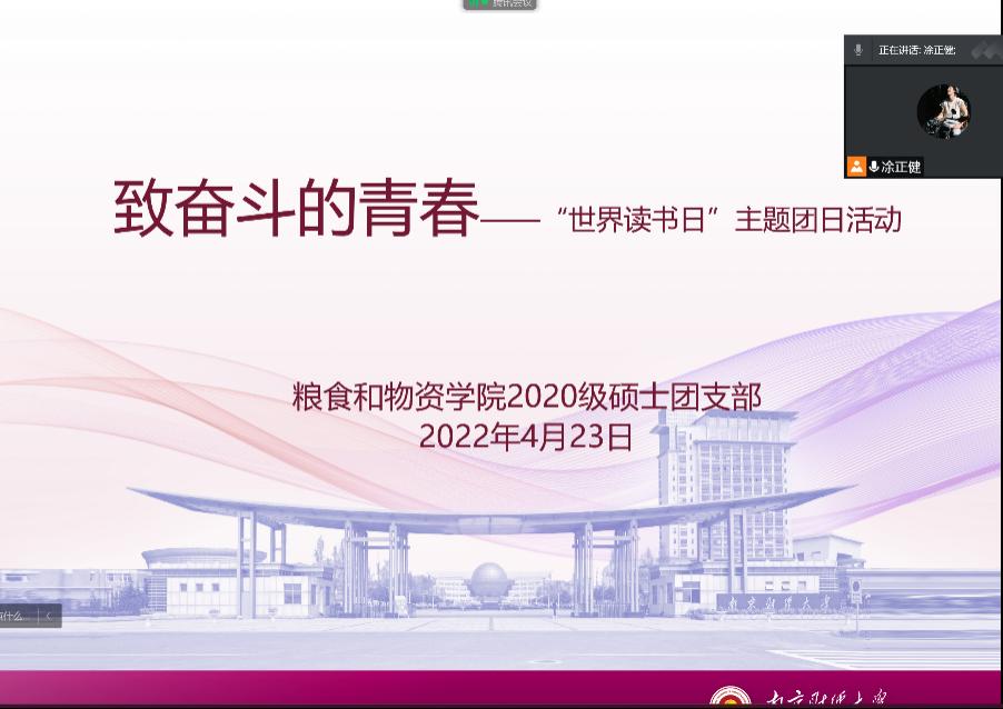 为了迎接4月23日第二十七个“世界读书日”的到来,提升硕博团支部全体同学的文化素养和精神内涵,2022年4月23日,yl23411永利集团官网硕士、博士各团支部积极组织全体党员和团员在线上腾讯会议开展“致奋斗的青春”主题读书会暨信仰公开课(素养专题),以此带动大家养成良好的读书习惯,形成“读书好、好读书、读好书”的学习风气,修身养性,发掘潜能,不断提高理论素养和文化水平。