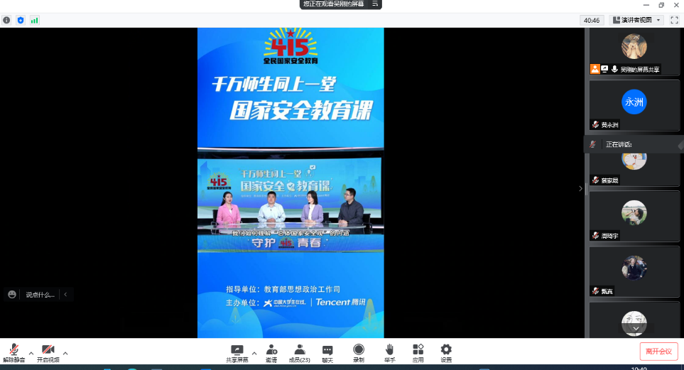 学院团总支于线上开展了国家安全教育主题团课,细致解读了《国家安全法》与《反间谍法》,并深刻学习了近期电信诈骗、网络诈骗与舆论安全的相关案例。课上团员青年们围绕国家安全及相关教育进行了热烈的讨论和交流,全方位、多角度畅谈对国家安全教育的理解与认识。