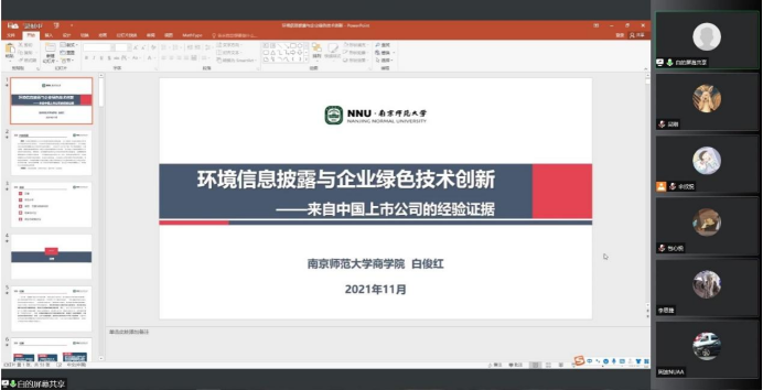 2021年11月29日上午,南京师范大学商学院院长、江苏省市场经济研究会常务理事、国家自然科学基金通讯评审专家、博士生导师白俊红教授应邀为我院师生开展了主题为“环境信息披露与企业绿色技术创新——来自中国上市公司的经验证据”的学术讲座。我院硕士生、博士生和部分青年教师积极参与聆听。