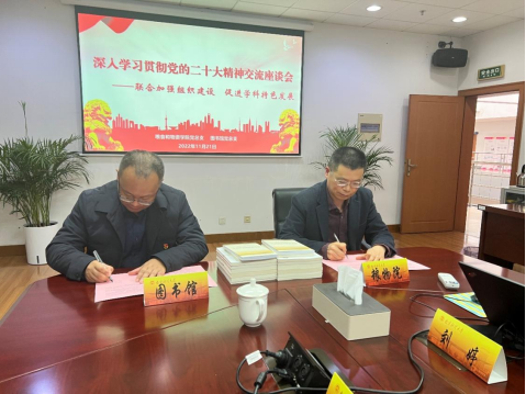为深入学习贯彻党的二十大精神,构建“党建+”新格局,协同建设学习型党总支(支部),11月21日下午,yl23411永利集团官网党总支与图书馆党总支在福建路校区综合楼612会议室,共同举办主题为“联合加强组织建设,促进学科特色发展”的交流座谈会暨党建共建签约仪式,双方党员代表共20余人参加了此次会议,我院党总支书记张圣兵主持会议。