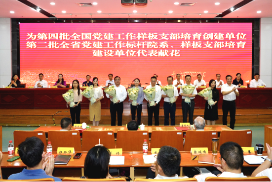 我院博士研究生党支部入选第二批全省党建工作样板支部培育建设单位,院党委书记吴丹作为代表接受张利民书记为8名第四批全国党建工作样板支部培育创建单位代表和第二批全省党建工作标杆院系、样板支部培育建设单位代表献花;院党委组织委员、专职组织员、辅导员吴利亚同志获评校2024年度优秀共产党员。会上,学校还为党员过集体“政治生日”,我院博士生党支部2022级博士研究生陈彦池同志作为全校13名新发展党员代表上台接受校党委送上的“红色生日礼包”。张利民向受到表彰的先进集体和先进个人表示热烈祝贺,向全校师生党员致以崇高敬意和节日的问候。