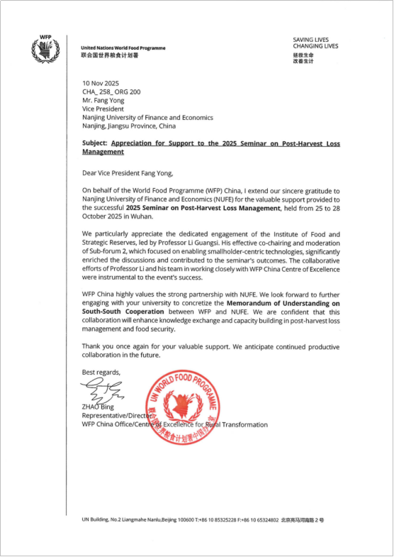 此次收到WFP的官方致谢,是我院长期以来深耕粮食领域、厚积薄发的必然结果,也是中国高校积极参与全球治理、贡献中国智慧的生动缩影。未来,我院将继续致力于与联合国世界粮食计划署等国际组织的紧密合作,以专业知识和实践经验,为推动全球粮食安全和可持续发展提供具有建设性的“南财方案”。