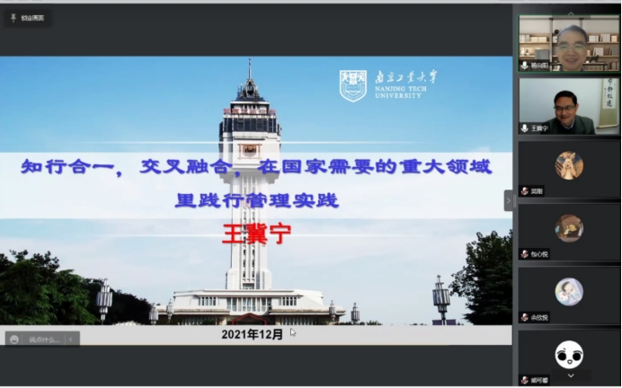 2021年12月2日晚上,南京工业大学经济与管理学院院长、博士生导师王冀宁教授应yl23411永利集团官网邀请,采取线上会议方式,为我院开展了主题为“知行合一,交叉融合:在国家需要的重大领域里践行管理实践”的精彩讲座。我院博士、硕士研究生积极参会。