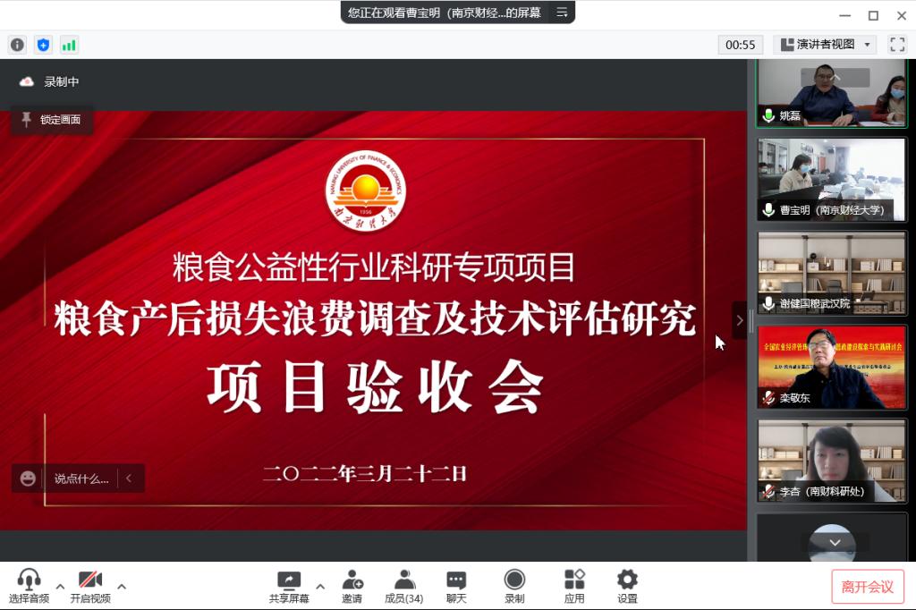 专家组组长、郑州中粮科研设计院教授级高工唐学军主持了项目验收工作,项目负责人曹宝明教授就项目研究工作开展情况、项目技术任务完成情况、项目经费预算执行与使用情况进行了详细汇报。专家组审阅了相关验收材料,经过质询讨论,一致同意该项目通过验收。专家组认为:该项目通过调查技术、统计技术、计量技术和模型技术的集成创新,构建了符合中国粮情实际的粮食损失调查评估指标体系、方法体系、数据体系、标准体系、模型体系、方案体系和对策体系。科学测定了2015-2016年主要粮油品种(稻谷、小麦、玉米、大豆、油菜籽、花生、马铃薯、甘薯)、不同环节(收获、农户储粮、储藏、运输、干燥、加工、销售、消费)、不同地区、不同规模、不同流通模式下的粮食产后损失浪费状况,粮食产后综合损失率为15.28%,油料产后综合损失率为14.96%;系统识别了影响粮食产后损失的影响因素;分类提出了有针对性的节粮减损措施,形成了数据库,搭建了粮食产后损失信息平台和爱粮节粮公共科普资源平台,为粮食行业全链条节粮减损、构筑无形良田、保障国家粮食安全提供了重要支撑。