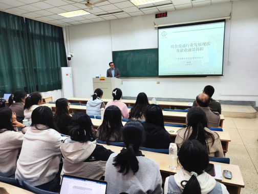 2023年11月13日,我院2013级博士校友、江苏省粮食集团企业管理部副部长、江苏永友食品科技有限公司副总经理、江苏永友物流有限公司副总经理顾智鹏应邀来我院开展了以“粮食流通行业发展现状及就业前景简析”为主题的就业大讲堂活动,活动由我院院长助理钱龙老师主持,我院硕博士研究生参加。